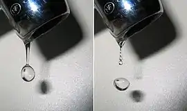 نگاره راست: قطره آبی که از شیر آب جدا شدهاست و پیرو آن قطرات ریزتر در حال گسستن هستند. نگاره وسط: لحظه تشکیل قطره آب هنگام سقوط از منبع نگاره چپ: پاشیدن قطرات آب به اطراف در اثر ضربه جسم خارجی | ||