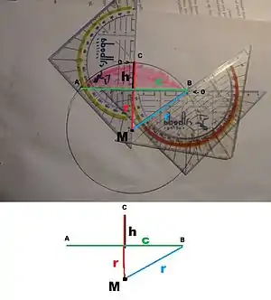 راه دیگری که به کمک آن بتوان شعاع دایره را بدست آورد استفاده از چند خطکش است به این ترتیب که اول یک خطکش را بر روی وتر قرار میدهیم آنگاه که وسط وتر را یافتیم خطکش دیگر را عمود بر آن قرار میدهیم و نقطهٔ C را علامت میزنیم، آنگاه خطکش دیگری را بر روی نقطهٔ B قرار میدهیم و آن قدر آن را جابجا میکنیم تا طول محل برخورد دو خطکش با هم برابر شود آن نقطه را M مینامیم، پاره خط MC و MB هر دو شعاعهای دایرهٔ مربوط به قطعهٔ دایرهاند. زاویهٔ BMC نیز برابر با ½ است.