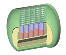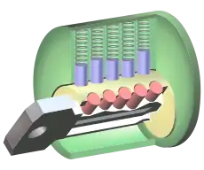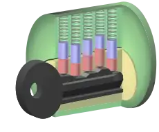 وقتی کلید حقیقی درون قفل فرو میرود، شکاف بین سوزنهای کلید (قرمز) و سوزنهای غلتان (آبی) با لبه توپی قفل (زرد) هم تراز میشوند