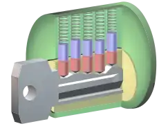 وقتی کلیدی در قفل نیست، سوزنهای غلتان (آبی) به سمت پایین در حالت فشار هستند و از چرخش توپی قفل (زرد) جلوگیری میکنند