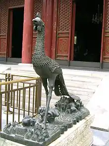 در اساطیر چین پرنده سرخ یا ققنوس نماد جنوب و مورد نیایش بود. ققنوس بعدها جای خود را به قرقاول داد. این پرنده در نقشهای برجای مانده دارای منقار خمیده، پنجهٔ بلند و تیز به شکل پرندگان شکاری بود و یاری دهندهٔ کشاورزان مزارع خشک جنوب بهشمار میآمد.[6]