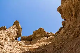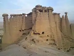 نمای بیرونی قلعه به شکل دیوارهای از دودکشهای به هم پیوسته و تعدادی دودکش جدا است که حفرههای پایین قلعه، ظاهری مرموز بدان بخشیده است. برخی از مردم محلی این آثار را به دلیل شکل عجیبشان «دودکش جن» مینامند و برخی نیز این قلعه را تخت دیو مینامند زیرا معتقد بودند دیوها روی تخته سنگهای مسطح بالای ستونها استراحت میکنند.[2]