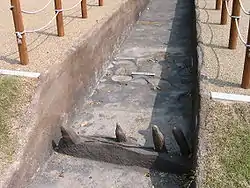 ![]() یک بخش کاشی از کف و پایه خاکی ساخته شده توسط تویوتومی هیدهیوشی در سال ۱۵۸۲ در طی محاصره تاکاماتسو. | |