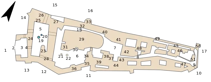 1 Hradčanské náměstí 2 Hradní brána 3 První nádvoří 4 Matthias Gate 5 Druhé nádvoří 6 Třetí nádvoří 7 Náměstí U Svatého Jiří 8 Ulice Jiřská 9 Východní brána 10 Staré zámecké schody 11 Na Valech 12 Rajská zahrada 13 Nové zámecké schody 14 Na Baště, Čtvrté nádvoří 15 Prašný most 16 Jelení příkop 17 Opyš 18 Ulice Vikářská 19 Kohl's Fountain 20 Studna 21 Obelisk (Prague Castle) 22 Statue of Saint George, Prague Castle 23 Kaple svatého Kříže 24 Plečnikova sloupová síň 25 Obrazárna Pražského hradu 26 Spanish Hall (Prague Castle) 27 Císařská konírna 28 Příjezd k bytu prezidenta 29 کلیسای ویتوس مقدس 30 Průhled do vykopávek 31 Staré proboštství 32 Na Vikárce a Slévárenský dvůr 33 Mihulka 34 Orlí kašna 35 Býčí schodiště 36 Prezidentská kancelář a byt 37 Old Royal Palace (Prague) 38 Jezdecké schody 39 Vladislav Hall 40 Kapitulní knihovna 41 Nové proboštství 42 کلیسای جورج مقدس 43 Ústav šlechtičen 44 All Saints Church (Prague Castle) 45 Golden Lane 46 Staré purkrabství 47 Lobkowicz Palace 48 St. George's Convent, Prague 49 Bílá věž (dnešní) 50 Daliborka 51 Černá věž