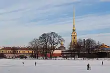 این قلعه شامل چندین بنای برجسته است که در اطراف کلیسای جامع پیتر و پل (۱۷۳۳-۱۷۱۲) قرار دارند. کلیسای جامع دارای یک برج ناقوس ۱۲۲٫۵ متر (۴۰۲ پا) است (بلندترین در مرکز شهر) و یک قبهٔ طلاکاری شده که بالای آن یک فرشته نهاده شده است.