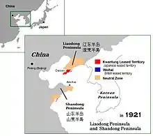 ![]() قلمروی اجارهای کوانتونگ در سال ۱۹۲۱ شامل منطقه نفوذ ژاپن و منطقه خنثی. | |||||||||||||