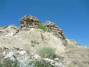 در بالای قله که زمینی صخرهای و سرسبز و نیمههموار با پوشش علفی و در حدود یک هزار متر مربع است، نشانههایی از دژ و اماکن مسکونی باستانی به چشم میخورد که امروزه جز تکههای خشت و سنگچین خرابههایش، چیزی از آن باقی نماندهاست.