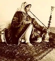 ![]() تصویر یک زن از دوره قاجار در حال استفاده از قلیان سنتی | |