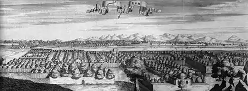 پادشاهان قاجاریه توجه بیشتری به قم نشان دادند. در زمان فتحعلیشاه قاجار شهر قم و مرقد فاطمه معصومه بازسازی شدند. در جنگ جهانی اول، دامنهٔ جنگ به حدی گسترش یافت که حتی قم را هم دربرگرفت و نیروهای روسیه و انگلیس به بهانههای مختلف آن را اشغال کردند. در پاییز سال ۱۲۹۴ خورشیدی، نیروهای روسیه با هدف تصرف تهران وارد کرج شدند. به این ترتیب پایتخت مورد تهدید جدی واقع شد. نزدیک شدن نیروهای روسیه به تهران سبب مهاجرت بسیاری از طبقات مختلف مردم به قم گردید.[31] در دوران پهلوی، قم مرکز مبارزه علیه سیاستهای حکومت پهلوی بود. اولین جرقه انقلاب ۱۹۷۹ ایران در بهمن سال ۱۳۴۱ خورشیدی در قم زده شد. روحالله خمینی که در نقش رهبر این انقلاب بود در قم به مخالفت با تصویبنامه انجمنهای ایالتی ولایتی و همینطور اصول ششگانه انقلاب شاه و ملت و لایحه کاپیتولاسیون پرداخت.[30]