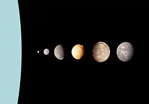 تصویری از شش قمر مشهور سیارهٔ اورانوس از چپ به راست: پاک، میراندا، آریل، اومبریل، تیتانیا و اوبرون