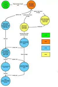 در حالی که معرفی شده در سال 2002 به عنوان یک عنوان جدید WWE اغلب اشاره به عناوین دیگر از جمله کسانی که از WCW و NWA با ادغام سابقه قهرمانی با تاریخچه کمربند است که نشان دهنده آن است.[9][10] به عنوان تأیید توسط WWE, جهان, سنگین وزن قهرمانی نیست ادامه WCW قهرمانی بلکه جانشین آن توسط راه WWE Undisputed Championship فقط به عنوان قهرمانی WCW چرخید از NWA World Heavyweight Championship. با توجه به ارتباط آن با هر دو عنوان آن اصل و نسب است که در ارتباط با اولین رسمیت شناخته قهرمانی سنگین وزن جهاناست.[11] در سال 2009 WWE منتشر شده در یک دی وی دی مجموعه ای به نام تاریخ جهان سنگین وزن قهرمانی که قطعی ارتباط به عنوان WCW و NWA عناوین.[12]
