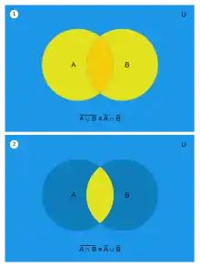 قوانین دمورگان که با نمودار ون نشان داده شده. در هر مورد، مجموعه حاصل با رنگ آبی مشخص شده است.