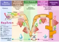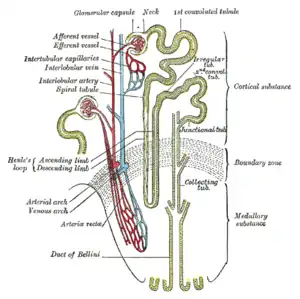 ![]() نمایی از لوله کلیوی و تأمین عروقی آن (قوس هنله در قسمت چپ-مرکزی قابل مشاهده است) | |