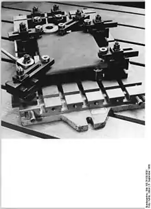 - برای بستن صفحات قالب جهت ماشینکاری به دلیل تعدد سوراخها، اپراتور مجبور است چندین بار جای گیرهها را عوض کند تا اینکه بتواند همهٔ سوراخها را بر روی صفحات ایجاد کند. امروزه صفحات توسط گیرههای مغناطیسی نگه داشته میشوند.[1]