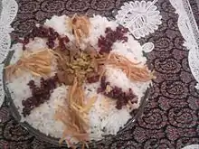 اضافه کردن یک قاشق غذاخوری زعفران حل شده به این قابلمه کار بعدی است. اکنون حرارت زیر قابلمه خاموش شده و زرشک به آن افزوده میشود و به هم زده میشود. (در این صورت زرشک رنگش را حفظ خواهد نمود)