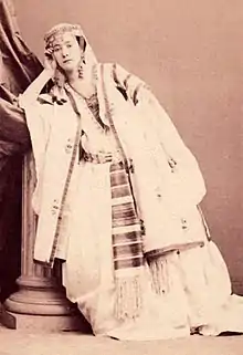 ![]() لئونتین د مائسن، حوالی سال ۱۸۶۳ میلادی. لباس او احتمالاً لباسی است که برای نقش لیلا در اپرای صیادان مروارید ژرژ بیزه بر تن کرده بود | |
