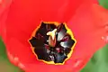- تخمدان: محتوی تخمکهاست که توسط پوشش احاطه شدهاست و بعد از لقاح به صورت بذر رشد مییابد. در مرکز گل لاله یک تخمدان بطری شکل، سه حجرهای وجود دارد که هر حجره شامل تعداد زیادی تخمک است. در بالای تخمدان نیز یک کلالهٔ سه قسمتی قرار گرفته که دانههای گرده به آن میچسبند. البته در اکثر گیاهان به جز گیاه لاله یک خامهٔ میانی بلند نیز بین تخمدان و کلاله قرار میگیرد. سلولهای نر که از دانههای گرده بهوجود میآیند، تخمکها را بارور نموده و تخمکهای بارور تبدیل به دانه میگردند در همین زمان بارور شدن و تبدیل تخمکها به دانهاست که تخمدان نیز تبدیل به میوه شده و به تدریج جدارههای آن خشک و سخت میشود. این چنین میوهای را کپسول مینامند و هنگامیکه دانهها رسیدند، این کپسول از بالا به وسیله سه شکاف بازمیگردد.[14] در بعضی از لالهها پرچم کرکدار و در برخی دیگر بدون کرک است.[15]
