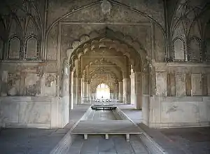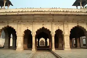 - دیوان عام (Diwan-i-Am) که حیاط بیرونی مستقل و بزرگی است که با سنگهای مرمر سفید فرش شده و شاه با ایدهای شبیه به بارعام سلیمان، بر روی ایوانی در روی دیوار شرقی میایستاده و با عموم دیدار میکردهاست.