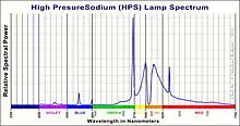 طیف نوری لامپهای سدیم پرفشار گستردهتر است و در آن نورهایی به غیر از زرد هم دیده میشود. نور لامپ سدیم پرفشار طلایی رنگ است. با توجه به بهرهٔ نوری بالا و رنگدهی پایین، لامپ سدیم سدیم کمفشار بیشتر برای روشنایی خیابانها و گذرگاهها استفاده میشود.[12]