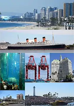 ![]() تصاویر از بالا، چپ به راست: Long Beach skyline from Bluff Park, RMS Queen Mary, Aquarium of the Pacific Blue Cavern exhibit, Hanjin Terminal at Port of Long Beach, Villa Riviera, Metro Blue Line, Long Beach Lighthouse | |