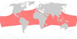 زیستگاه لاکپشتهای دریایی پوزهعقابی بسیار گستردهاست و بیشتر در صخرههای استوایی اقیانوس هند، اطلس و آرام یافت میشوند. از بین تمام گونههای لاکپشت دریایی، ای. ایمبریکاتا[persian-alpha 3] بیشترین ارتباط را با آبهای استوایی گرم دارد. دو زیرمجموعه اصلی از این گونه در اقیانوس اطلس و هند-آرام شناسایی شدهاند.[12]