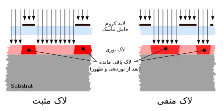 - لاک مثبت (به انگلیسی: positive resist): حلالیت با تابش زیادتر میشود.