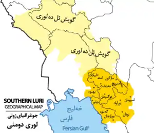 ![]() مناطقی در جنوب ایران که به زبان لری جنوبی تکلم میکنند (زرد پررنگ) | |