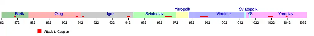 در نمودار زمانی ذیل دوران حکومت هریک از فرمانروایان روسهای وارنگی آمدهاست. نقاط سرخ به معنی حملات دریایی روسان در زمان حکومت فرمانروای قید شده به سواحل دریای خزر است: