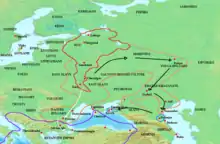 تاریخها به رنگ آبی یورشهای اصلی روسها را نشان میدهند؛ خط بسته به رنگ بنفش منطقهٔ تحت تأثیر قرار گرفته در حملهٔ سال ۹۱۳ به دریای خزر را نشان میدهد. نام کشورها و دولتهای سیاسی به حدود سال ۹۵۰ مربوط میشود.