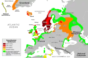 وایکینگها مردمی در شمال اروپا بودند که به تعبیر آرتور کستلر به صورت ناگهانی «مانند آتشفشانی» به سمت جنوب هجوم آوردند و به حملات شدیدی علیه ملل مختلف دست زدند. در حالی که عدهای از آنها به غرب رفته و در ایسلند و نورماندی ساکن شدند و حتی به قاره آمریکا رسیدند، عدهٔ دیگری از آنها به شرق آمده و تا دریای مازندران پیشروی کردند.[22] در اوایل قرن نهم میلادی،[23] روسهای وارنگی، که وایکینگهای به شرق آمده بودند، پس از عبور از دریای بالتیک و خلیج فنلاند از راه رود وولخوف به دریاچه ایلمن در جنوب سن پترزبورگ وارد شده و شهر نووگورود را در جزیرهٔ مناسبی ساختند.[24] همچنین روسها یک شهر به نام آلدیگجا را بنا نهاده بودند، این شهر حدود ۹٫۷ کیلومتری جنوب رود وولخوف، در دهانهٔ دریاچه لادوگا، بود.[23]