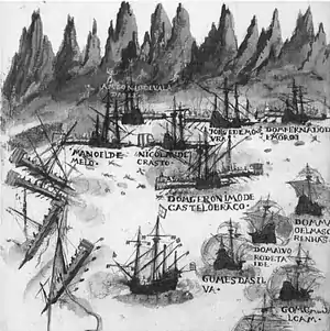 ![]() ![]() سیدی علی رئیس و ناوگانش که در کمین نیروهای پرتغالی در هنگامی که میخواستند ناوگان خود را از بصره به سوئز برگردانند در اوت ۱۵۵۴. | |||||||