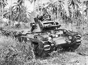 ![]() یک تانک ماتیلدا، با نام «کلینچر»، در ۹ نوامبر ۱۹۴۳ به سمت نقاط قوت ژاپن در نزدیکی Finschhafen حرکت میکند. | |||||||