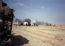 گردان چهارم از توپخانه سوم لشکر ۲ زرهی در حال حملات آتشبار بر مواضع عراق در جنگ خلیج فارس، فوریه ۱۹۹۱.