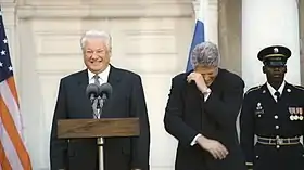 بوریس یلتسین و بیل کلینتون درحال خندیدن به یک لطیفه