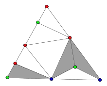- رأسهای روی یال از مثلث را با دو رنگ سبز و قرمز و رأسهای روی یال را با دو رنگ قرمز و آبی و رأسهای روی یال را با دو رنگ سبز و آبی رنگ میکنیم (در واقع رأسهای روی یالهای تنها با رنگهای دوسر یالشان در مثلث بزرگ رنگ میشوند).