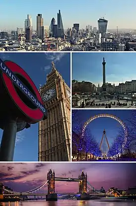 ![]() از بالا در جهت گردش عقربههای ساعت: چشم انداز سیتی لندن, میدان ترافالگار، چشم لندن، تاور بریج و متروی لندن همراه ساعت بیگ بن | |