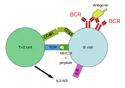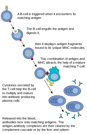 هنگامی که یک پاتوژن توسط یک سلول ارائه دهندهٔ آنتی ژن مثل ماکروفاژ یا سلول دندریتیک بلع میشود، پروتینهای پاتوژن سپس به پپتیدهایی هضم شده و به پروتیینهای MHC کلاس ۲ متصل میشوند. این کمپلکس سپس به خارج از غشائ سلول انتقال داده میشود. اکنون این ماکروفاژ فعال شدهاست تا چندین سیگنال را به یک سلول تی خاص که پپتید ارائه شده را میشناسد تحویل دهد.سلول تی سپس تحریک میشود تا اتوکرین ها(پیام رسانی اتوکرین) را تولید کند که این امر منجر به تکثیر و تمایز به سلولهای تی خاطره و اثرگذار میشود. سلولهای تی کمکی سپس از طریق یک پدیده به نام سیناپس ایمونولوژیکی سلولهای بی خاص را فعال میکنند. سلولهای بی فعال سپس آنتی بادیهایی تولید میکنند که این آنتی بادیها به پیشگیری از پاتوژنها تا زمانی که فاگوسیت ها(یعنی ماکروفاژها، نوتروفیلها)یا سیستم کمپلمان میزبان را از پاتوژنها پاک میکنند، کمک خواهد کرد. اکثر آنتی ژنها وابسته به سلول تی هستند، به این معنی که کمک سلول تی برای تولید آنتی بادی حداکثر لازم است. با یک آنتی ژن وابسته به سلول تی، اولین سیگنال از اتصال متقاطع آنتی ژن با گیرندهٔ سلول بی(BCR)و دومین سیگنال از تحریک همزمان بوسیلهٔ سلول تی میآید. آنتی ژنهای وابسته به سلولهای تی شامل پروتئینهایی میشوند که روی MHC کلاس ۲ی سلول بی به یک زیرنوع خاص از سلول تی به نام Th۲ ارائه میشوند. زمانی که یک سلول بی همان آنتی ژن را پردازش کرده و به سلول Th آماده(primed) ارائه میدهد، سلول تی سایتوکایینهایی ترشح میکند که سلول بی را فعال میکند.این سایتوکایینها تکثیر و تمایز سلول بی به پلاسماسلها را آغاز میکنند. تغییر ایزوتیپ(Isotype switching) به IgG، IgAو IgE و تولید سلول خاطره، در پاسخ به آنتی ژنهای وابسته به تی رخ میدهد.این تغییر ایزوتایپ نوترکیبی تغییر کلاس(CSR) نام دارد. زمانی که این تغییر رخ داد سلول بی خاص دیگر نمیتواند ایزوتایپهای اولیهٔ IgM و IgD را تولید کند.