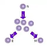2. Some of the T cell clones will differentiate into effector T cells (E) that will perform the function of that cell (e.g. produce cytokines in the case of helper T cells or invoke cell killing in the case of cytotoxic T cells).