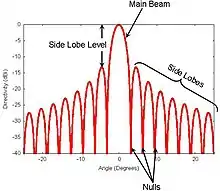 الگوی تابش اکثر آنتنها الگویی از "لوب هاً را در زوایای مختلف نشان میدهد. جهاتی که قدرت سیگنال تابش شده به حداکثر میرسد، با "null"هایی از هم جدا میشوند. این Nullها زاویههایی هستند که در آن قدرت سیگنال تابشی به صفر میرسد (Null به معنای صفر، بیارزش و تهی میباشد). این موضوع را میتوان به عنوان الگوی پراش آنتن مشاهده کرد. در یک آنتن جهت دار که هدف تابش امواج رادیویی فقط در یک جهت خاص است، لوب در آن جهت طوری طراحی میشود که بیشترین قدرت میدان را داشته باشد و به آن لوب اصلی میگویند. به سایر لوبها، "لوبهای جانبی" گفته میشود، و معمولاً نشان دهنده تابشهای ناخواسته در جهات ناخواسته است. لوب جانبی قرار گرفته دقیقاً در پشت لوب اصلی، "بک لوب" یا "لوب عقب" خوانده میشود. هر چه طول آنتن نسبت به طول موج رادیویی بیشتر باشد، الگوی تابش، لوبهای بیشتری خواهد داشت. در آنتنهای فرستنده، لوبهای جانبی بیش از حد، باعث هدر رفت انرژی میشود و ممکن است برای سایر تجهیزات تداخل ایجاد کند. عیب دیگر این است که ممکن است اطلاعات محرمانه توسط گیرندههای ناخواسته جمعآوری شود. در آنتنهای گیرنده، لوبهای جانبی ممکن است سیگنالهای مداخله گر را دریافت کند، و سطح نویز را در گیرنده افزایش دهد.