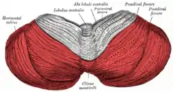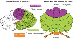 ![]() نمای فوقانی از یک مخچه. لوب خلفی به رنگ قرمز نشان داده شده. | |