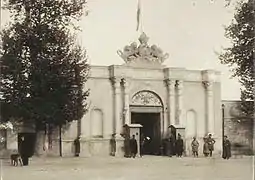 نمایی از نخستین سردر عمارت بهارستان به همراه نوشته عدل مظفر در بالای سردر