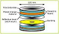 هر دیسک سی دی یا دی وی دی متشکل از چند لایهاست. البته انواع مختلف این دیسکها که به آنها پرداخته شد، تعداد لایههای متفاوتی نسبت به یکدیگر دارند. اما ما در اینجا به علت جامع و شامل بودن تعداد لایههای دی وی دی دو لایهٔ دوطرفه که قابلیت رایت مجدد را دارد، به بررسی این نمونه میپردازیم؛ دیگر نمونهها را میتوان حالت خاصی از این نمونه تصور کرد. همانطور که در شکل ۱۰ دیده میشود، این نوع از چند لایه به این شرح تشکیل شدهاست: