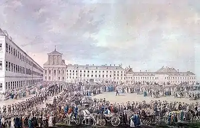 در مراسم تشییعِ جنازهٔ بتهوون در ۲۹ مارس ۱۸۲۷، طبق تخمینهای متفاوتی که از شاهدان عینی نقل میشود، حدود ده تا سی هزار نفر حضور داشتهاند که تا آن زمان بیسابقه بود.[103] فرانتس شوبرت، که مشعلدارِ این مراسم بود، سال بعد درگذشت و در کنار او دفن شد. تشییع پیکر وی پس از خواندن مناجات و دعای آمرزش در کلیسای مقدس[persian-alpha 54]، به گورستان اختصاصی در قبرستان واهرینگ[persian-alpha 55]، شمال غربیِ وین، منتقل و به خاک سپرده شد. در سال ۱۸۶۲، چند سال پس از خاکسپاری بقایای جسدِ وی برای مطالعه مجدد نبش قبر شد و در سال ۱۸۸۸ به گورستان زنترالفریدوف[persian-alpha 56] وین منتقل شد.[100]
