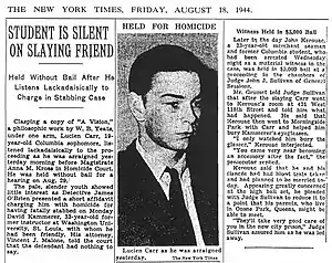 در ۱۳ اوت ۱۹۴۴، در روزی که متفقین نیروهایشان را با موفقیت در سواحل جنوبی فرانسه پیاده کردند، نیویورک تایمز به جای پرداختن به خبر پیشروی متفقین، ترجیح داد صفحه اول خود را به ماجرای یک قتل اختصاص دهد: «دانشجوی کلمبیا دوستش را به قتل رساند و جسدش را در رودخانه هادسن غرق کرد.» لوسین کار، دانشجوی ۱۹ ساله دانشگاه کلمبیا، در ساعات اولیه صبح، در پارک ریورساید در شمال غرب منهتن، مردی را با ضربات متعدد چاقو به قتل رساند. سپس جیبهای مقتول را با سنگ پر کرد و جسد را در رودخانه انداخت.[7]