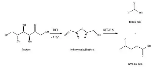 روش اصلی و سنتی تهیه لوولینیک اسید از طریق گرما دادن به هگزوزها (مانند گلوکز و فروکتوز) یا نشاسته در یک محلول رقیق اسید کلریدریک یا اسید سولفوریک مبتنی است.[2][3][4] بازده تولید بستگی به نوع اسید مورد استفاده، غلظت اسید و همچنین دما و فشار واکنش دارد.[5] محصولات فرعی این واکنش اسید فرمیک و مواد محلول و نامحلول با رنگ متمایز (معمولا زرد متمایل به قهوهای) هستند.