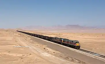 نگارهای از یک لوکوموتیو سری جیئی یو۳۰سی متعلق به راهآهن ایران در حال انتقال بار سنگ آهن در منطقهای بین بافق و یزد.