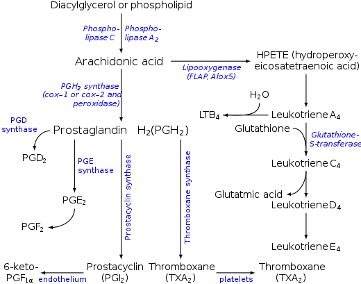 آنزیم فسفولیپاز فسفولیپیدهای غشای سلول (استریفیه) را به اسید آراشیدونیک (غیراستریفیه) تبدیل میکند. سپس آنزیم سیکلواکسیژناز باعث تبدیل اسید آراشیدونیک به پروستاگلاندینها میشود. آنزیم لیپواکسیژناز موجب تبدیل آرشیدونیک اسید به لکوترینها میشود. لکوترینها در ریه موجب افزایش پاسخهای التهابی ، افزایش ترشحات مخاطی و انقباض عضلات صاف جدار برونشها میشوند لذا آنتاگونیستهای لکوترین مانند مونته لوکاست و زافیرلوکاست در درمان آسم کاربرد دارد.