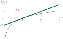 به عبارت دیگر برابر است با سطح میان محور xها و نمودار تابع از ۱ = x تا (شکل مقابل). این مطلب، از نتایج قضیهٔ اساسی حسابان و اینکه مشتق ، است، میباشد. عبارت سمت راست این رابطه را میتوان به عنوان تعریفی برای لگاریتم طبیعی در نظر گرفت. فرمولهای ضرب و توان لگاریتمی را میتوان از این تعریف نتیجه گرفت.[37] برای نمونه را میتوان به صورت زیر نتیجه گرفت: