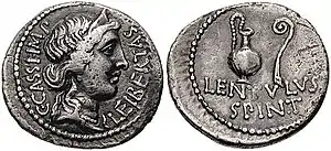 دناریوس (۴۲ پیش از میلاد) ضرب شده توسط گایوس کاسیوس لونگینوس و لنتولوس اسپیندر, که تصاویری از لیبرتاس و تاج او را نمایش میدهد.