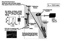 - یک منبع تابش به همراه خروجی با توان بالا باید استفاده شود. معمولاً لیزر یا تخلیه الکتریکی برای ایجاد یک پلاسمای گاز Xe که با طول موجهای بین ۱۰٫۵ تا nm14 منتشر میشود، استفاده میشود. اندازه و درخشندگی منبع نوری باید با طراحی سیستم متمرکزکننده بازتابی هماهنگ باشد.